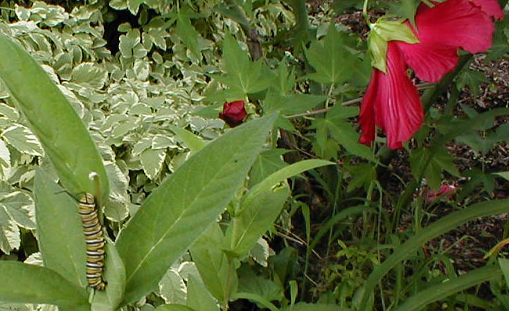 Build it and they will come. This monarch caterpillar (on left) found the swamp milkweed in the rain garden the first year it was planted.