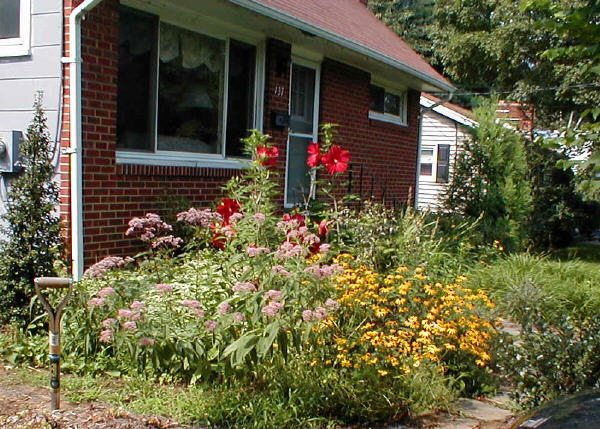 Swamp milkweed, Joe Pye Weed, New England aster, Wild Bergamot, and Black-eyed Susan are native to the Chesapeake region.Lord Baltimore hibiscus is a hybrid of the native hibicus,Lance-leaf Coreopsis is native to the Midwest. Kwanso daylily is native of China.