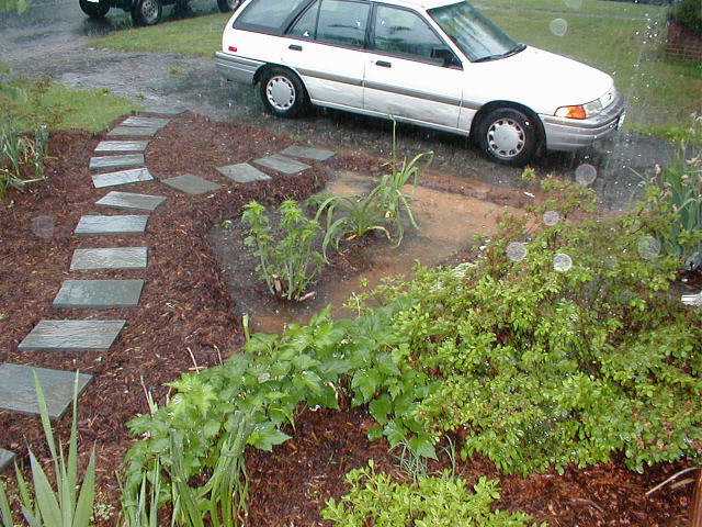 The rain garden at the height of our rainstorm on 5-18-2002. The garden filled with water, but did not overflow. Within 2 hours after the rain ended, all the water had infiltrated into the ground. Note that "muddy" looking areas are in spots where future plants are to be placed. Mulched areas (which will cover the entire garden once completed) had clear water.